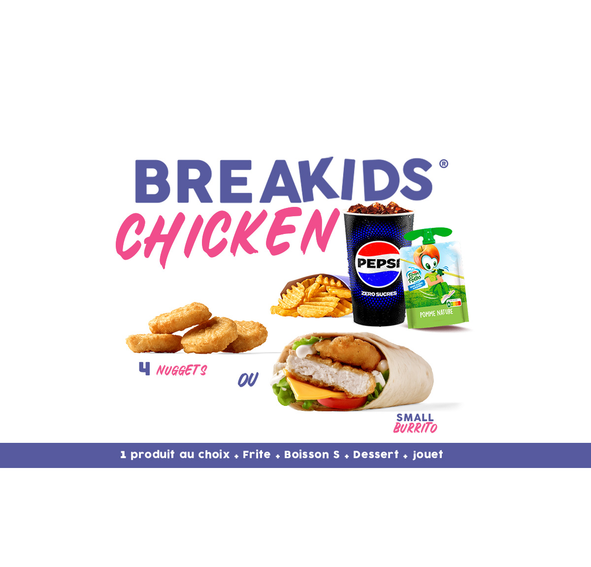 Découvrir le menu Breakids Le menu Breakids Mini Burger Petite Frite Boisson au choix Surprise / Jouet